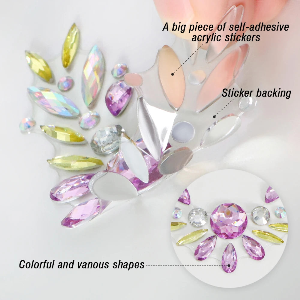 【Easy to Apply & Remove】6 Sheets face jewels stick on are prepared in individual sheet.This festival face jewels are Self-adhesive,so face crystals stick on is easy,just peel off from the backing paper and stick according to the designs.No more need to use extra glue.