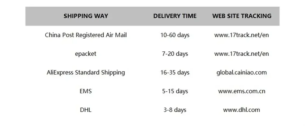 Other countries: 15 - 45 days by China Post Air Mail or Aliexpress standard shipping.