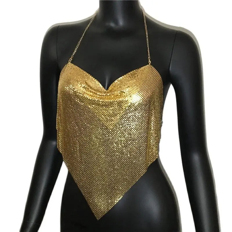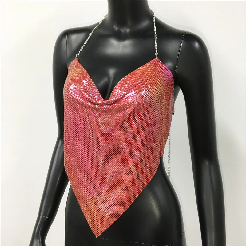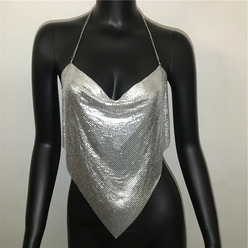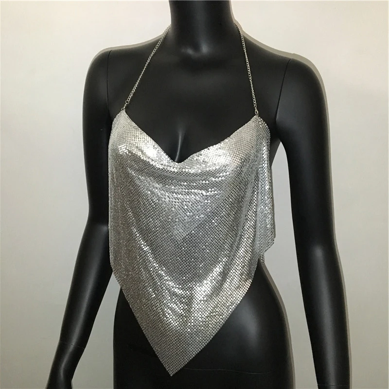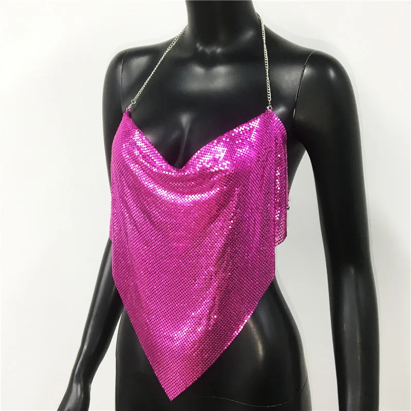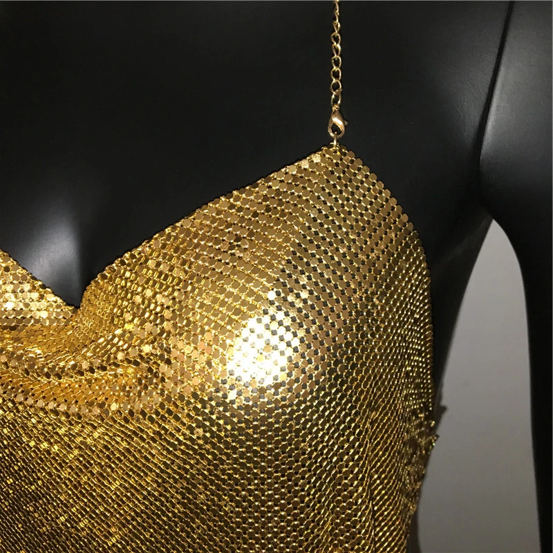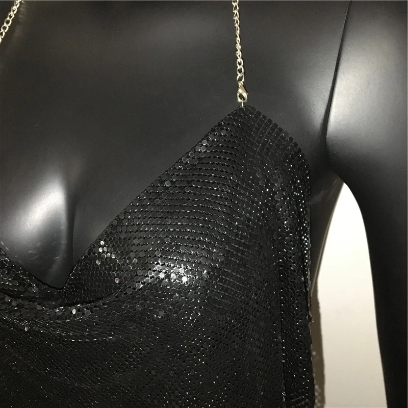 Glänsande metall paljetter Linne för kvinnor Sexig rygglös V-hals Justerbar kedja Crop Top Lady Festival Rave Party Club