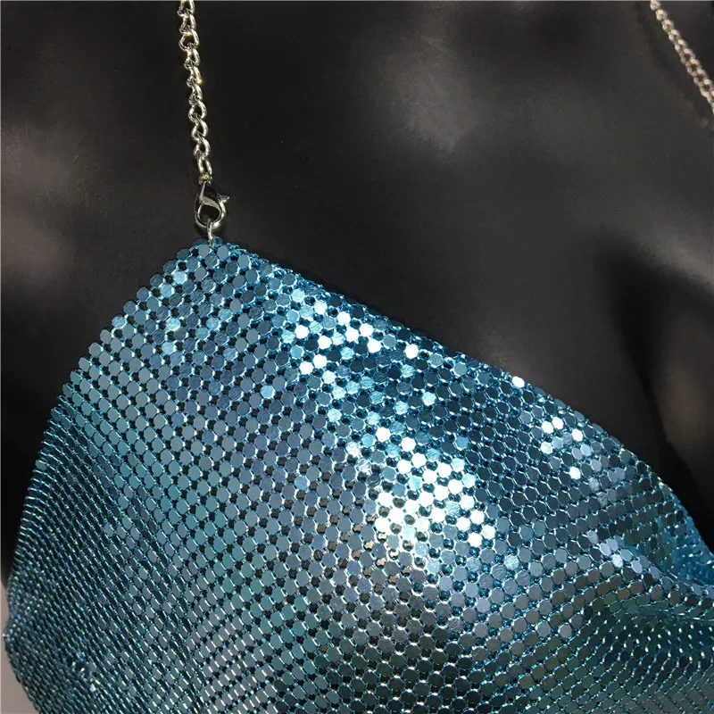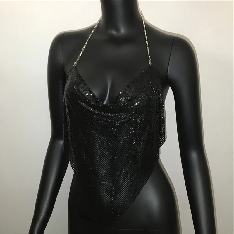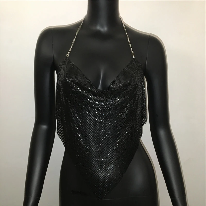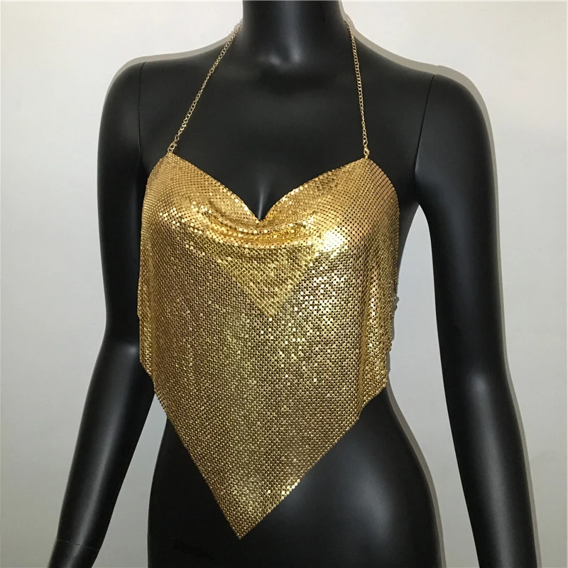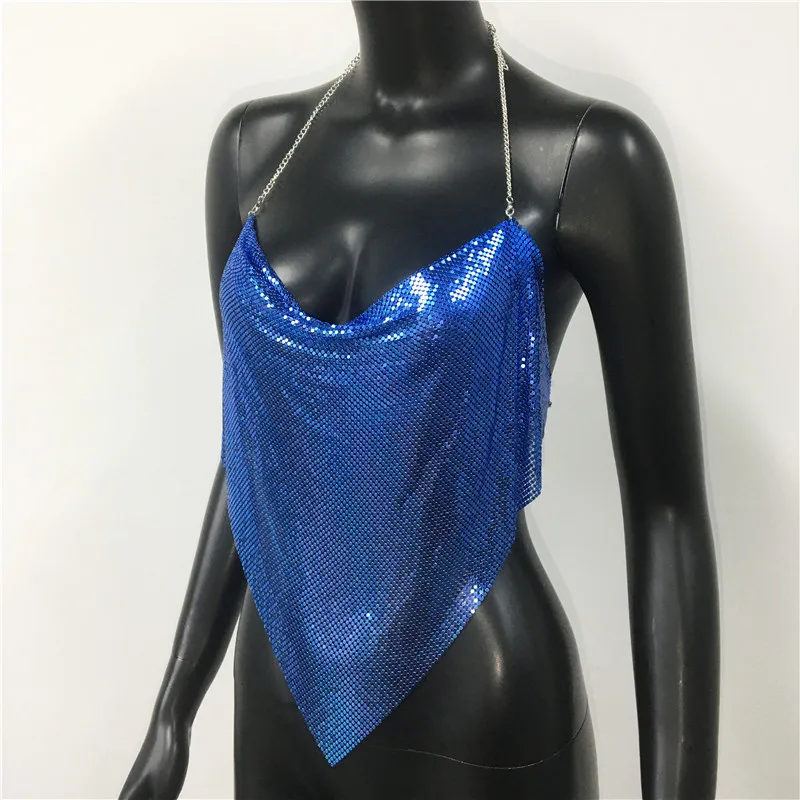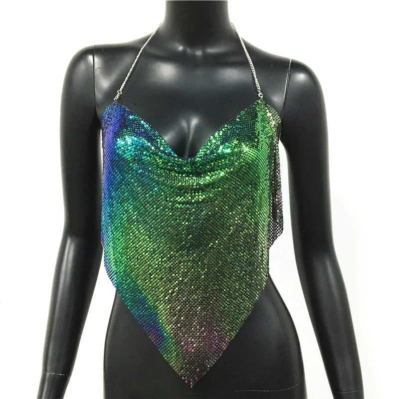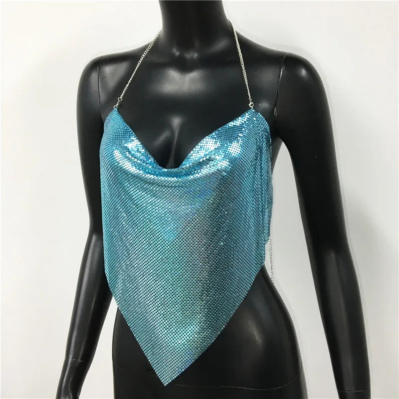 Glänsande metall paljetter Linne för kvinnor Sexig rygglös V-hals Justerbar kedja Crop Top Lady Festival Rave Party Club