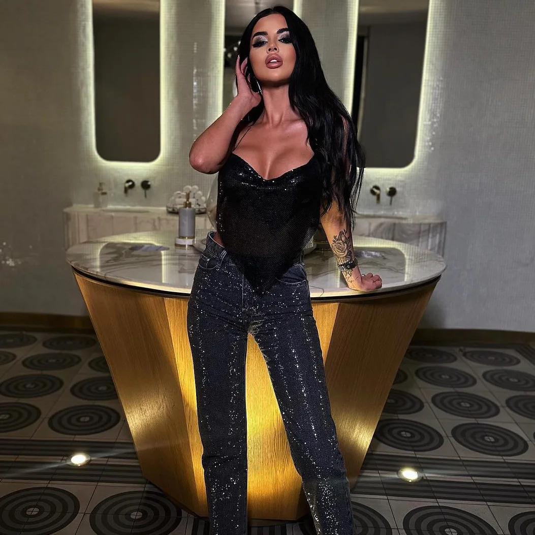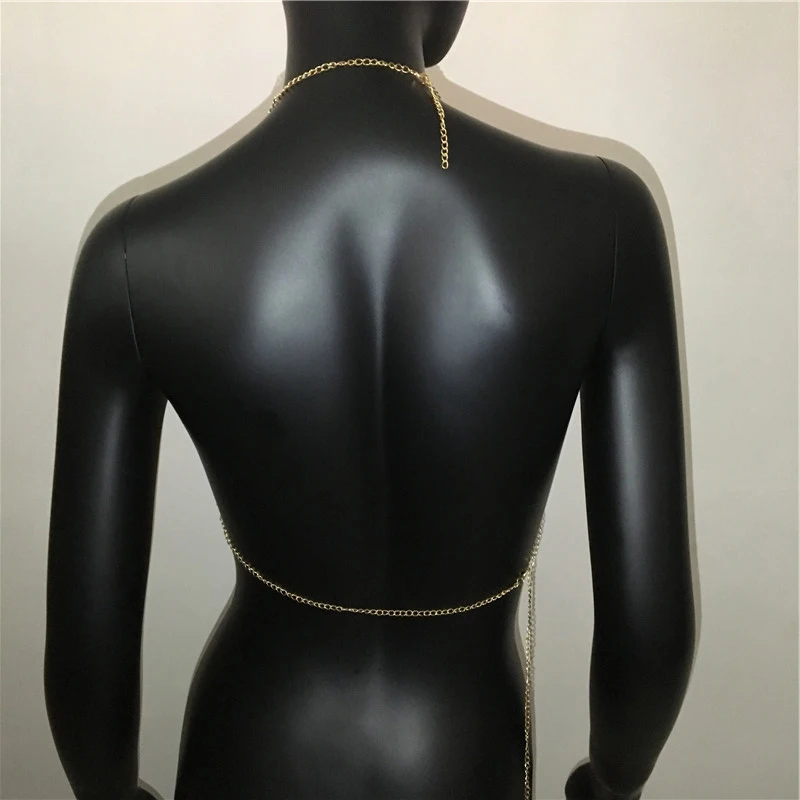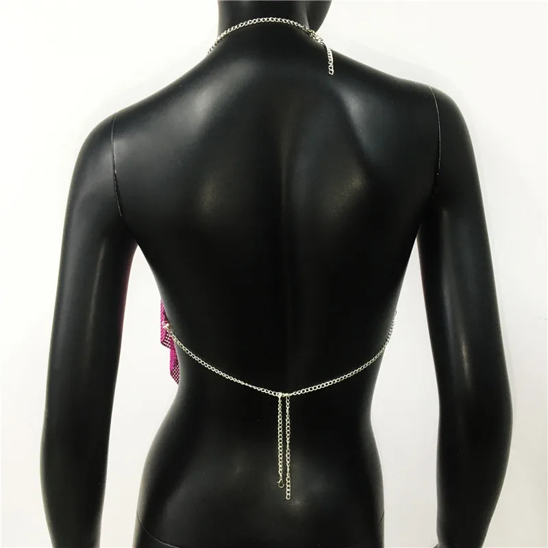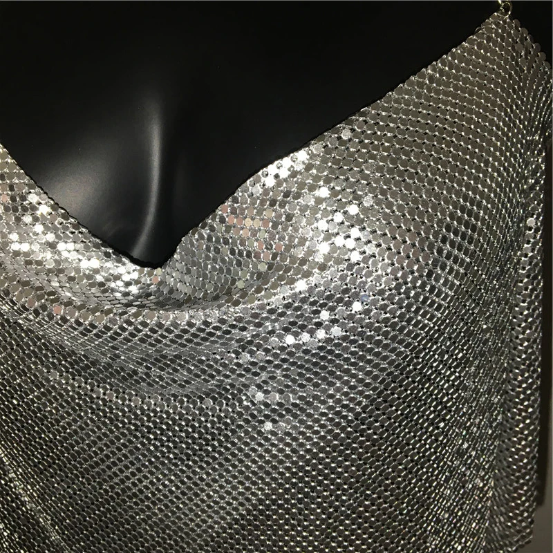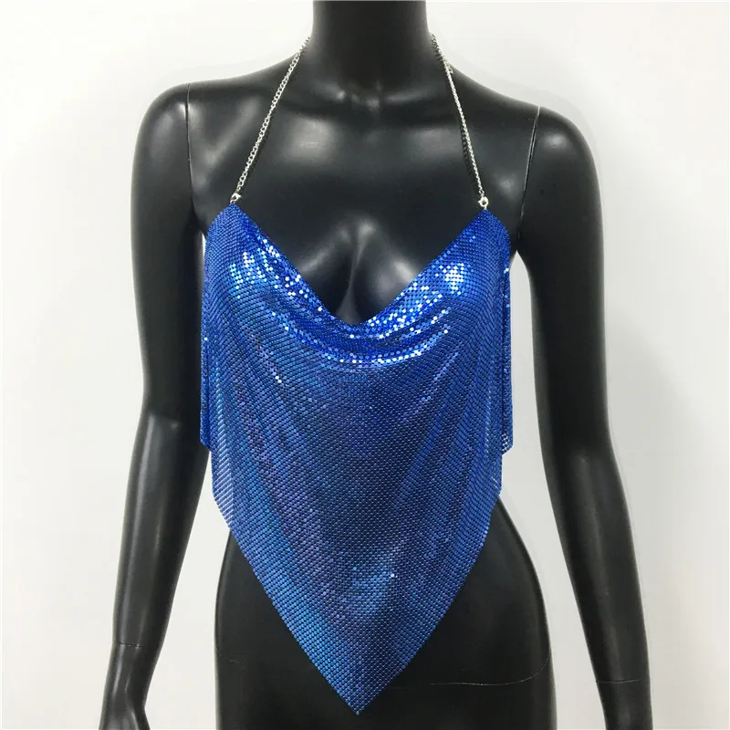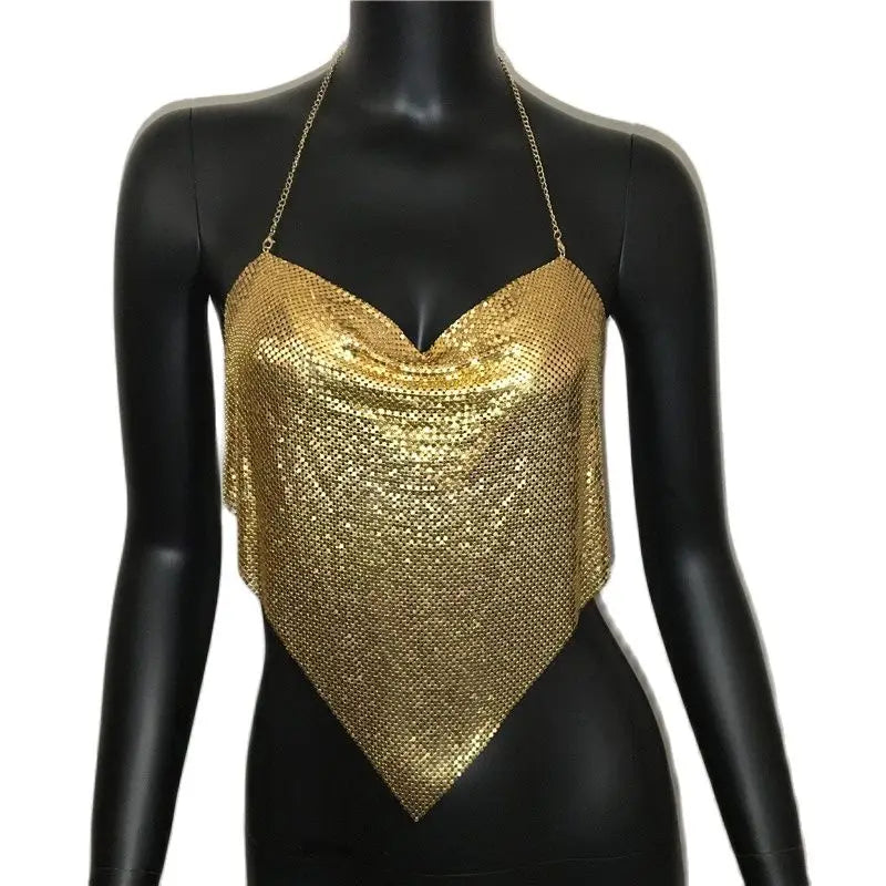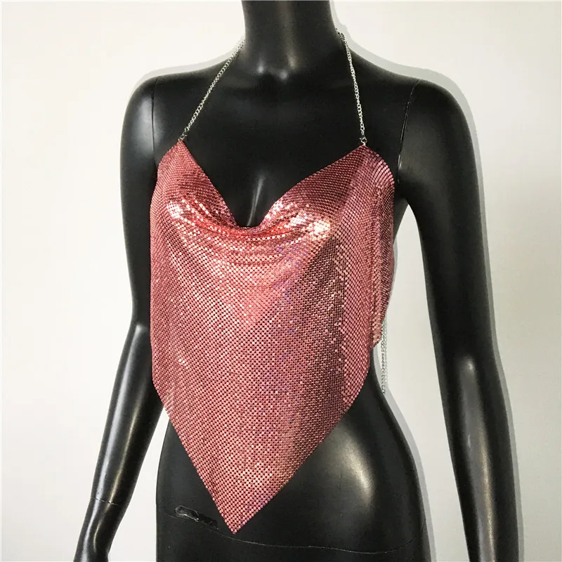 Glänsande metall paljetter Linne för kvinnor Sexig rygglös V-hals Justerbar kedja Crop Top Lady Festival Rave Party Club