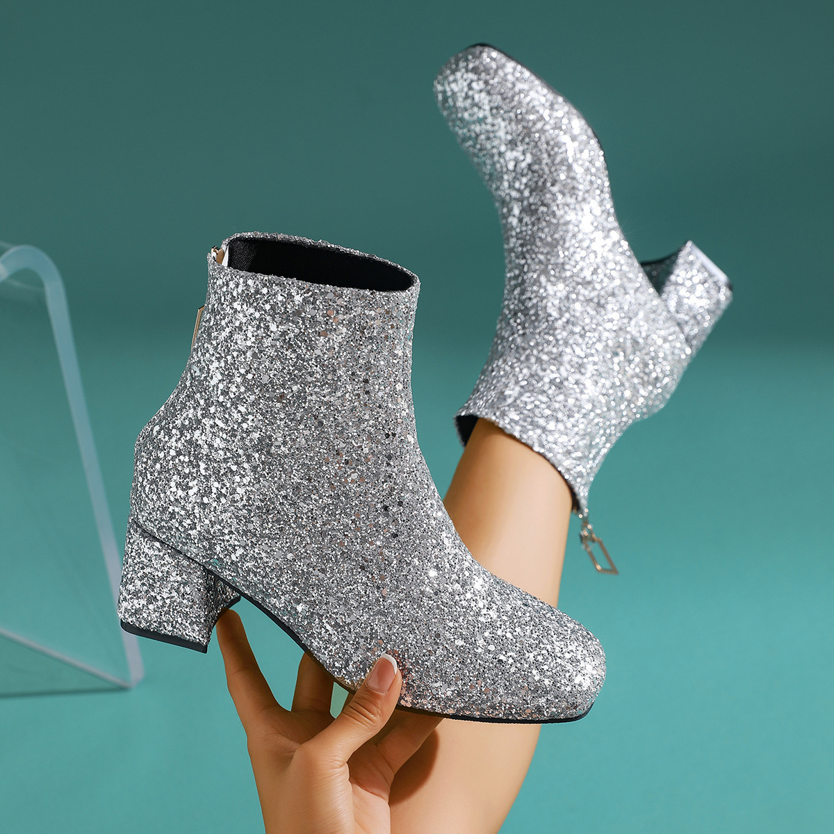 Produktinformation: Mönster: enfärgad Tåhållarform: Spetsig Färg: guld, silver, svart Övre höjd: Mellan höjd Sko Ovanmaterial: pu Strumplängd: mitten av vaden Klackform: tjock klack Bärmetod: dragkedja bak Storlek: 35, 36, 37, 38, 39, 40, 41, 42 Tillämpligt kön: Kvinna Sulmaterial: gummi Tillämplig ålder: Vuxen