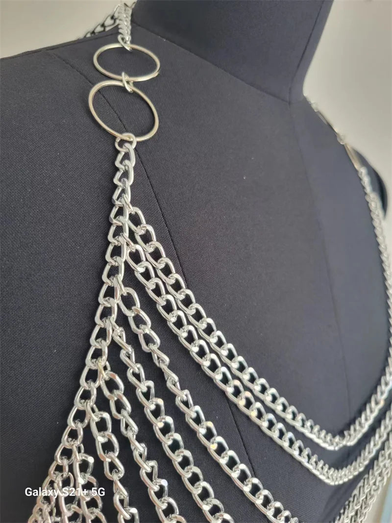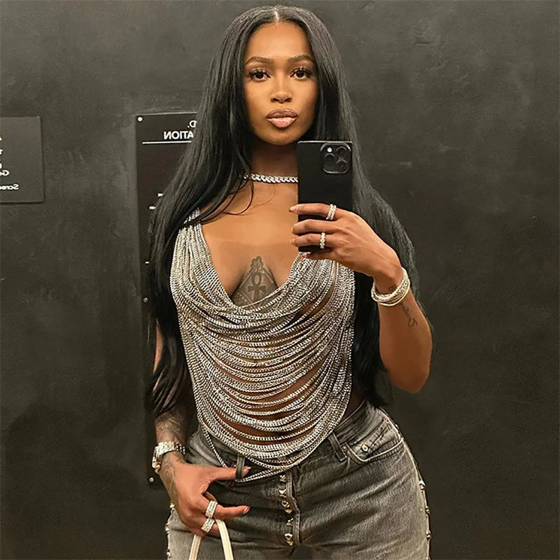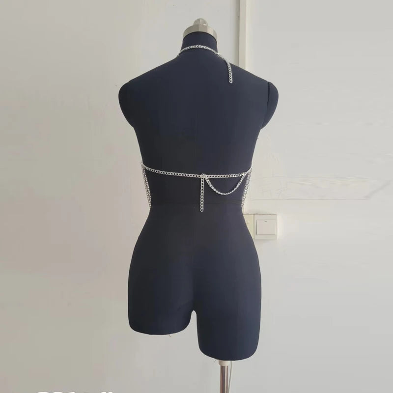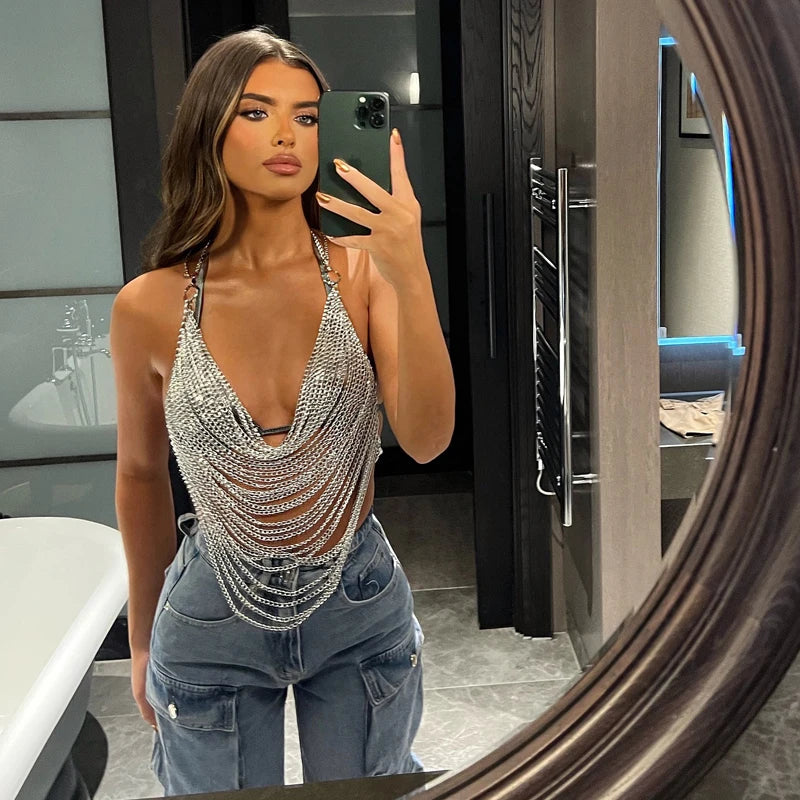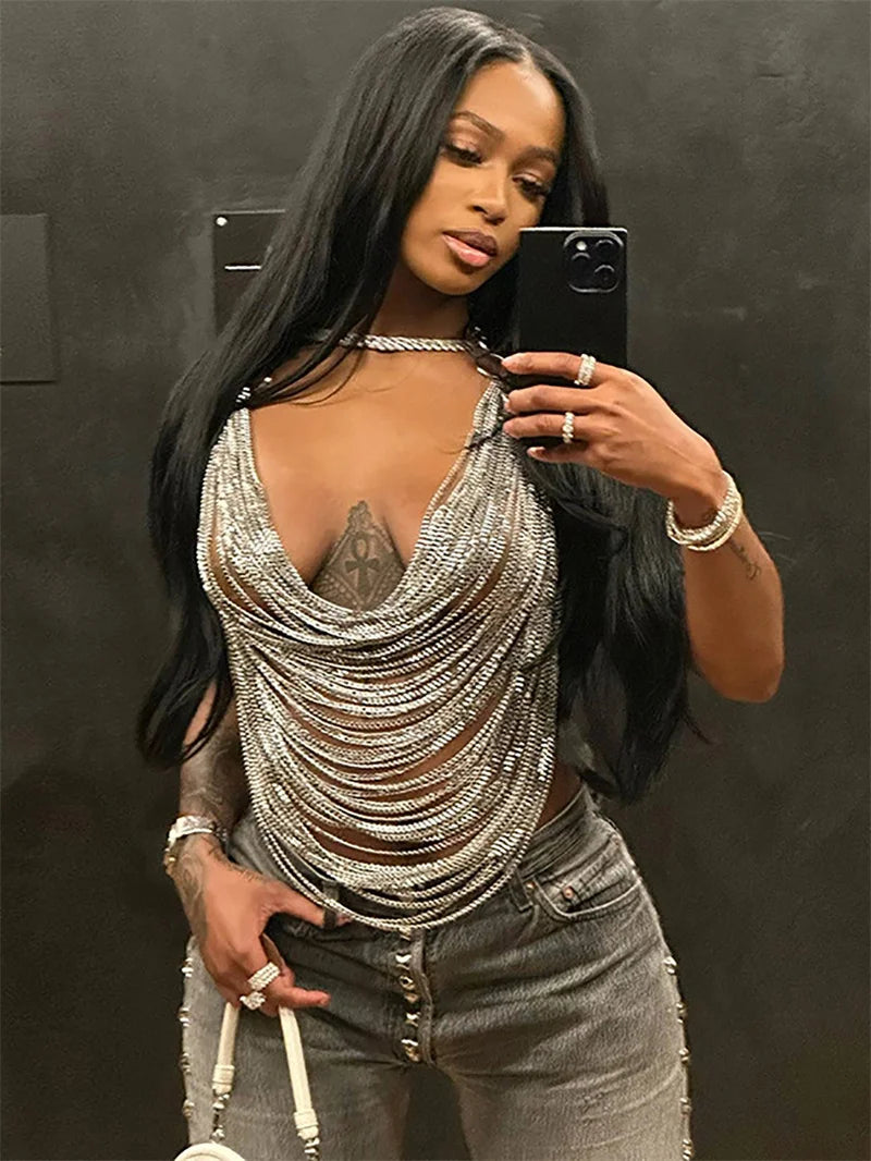 Metallkedjedetaljerna runt midjan skapar en kroppskedjeeffekt, vilket ger en fashionabel twist till denna redan snygga topp.