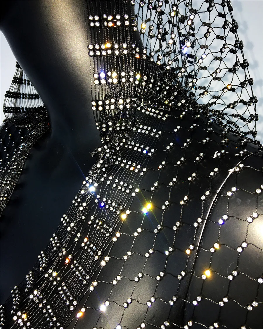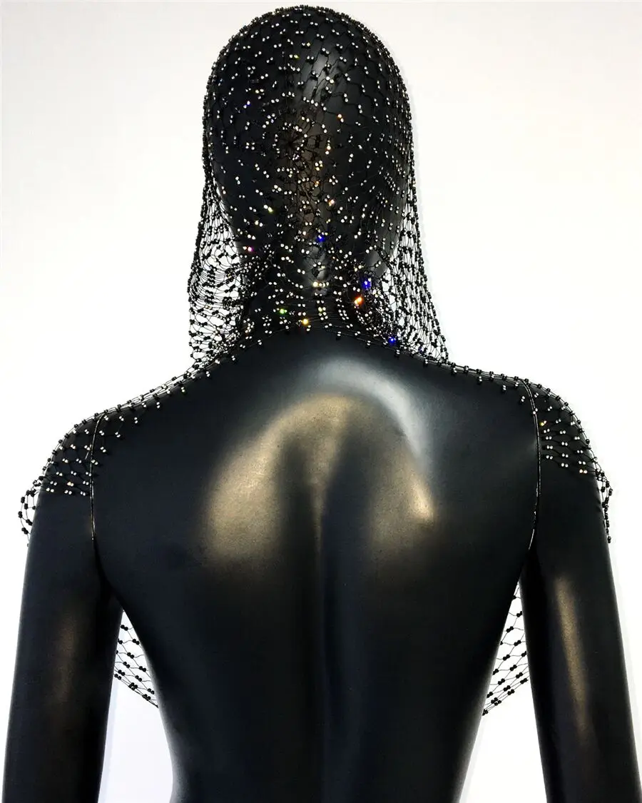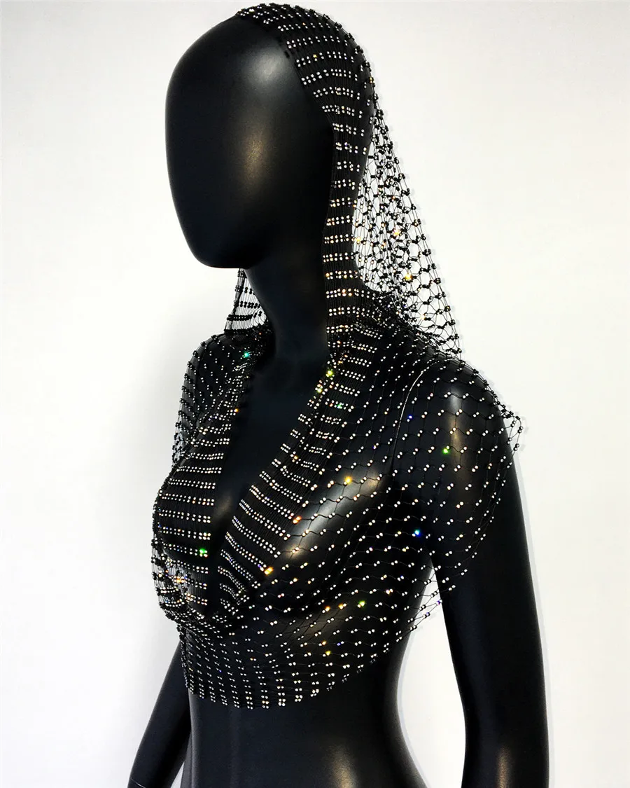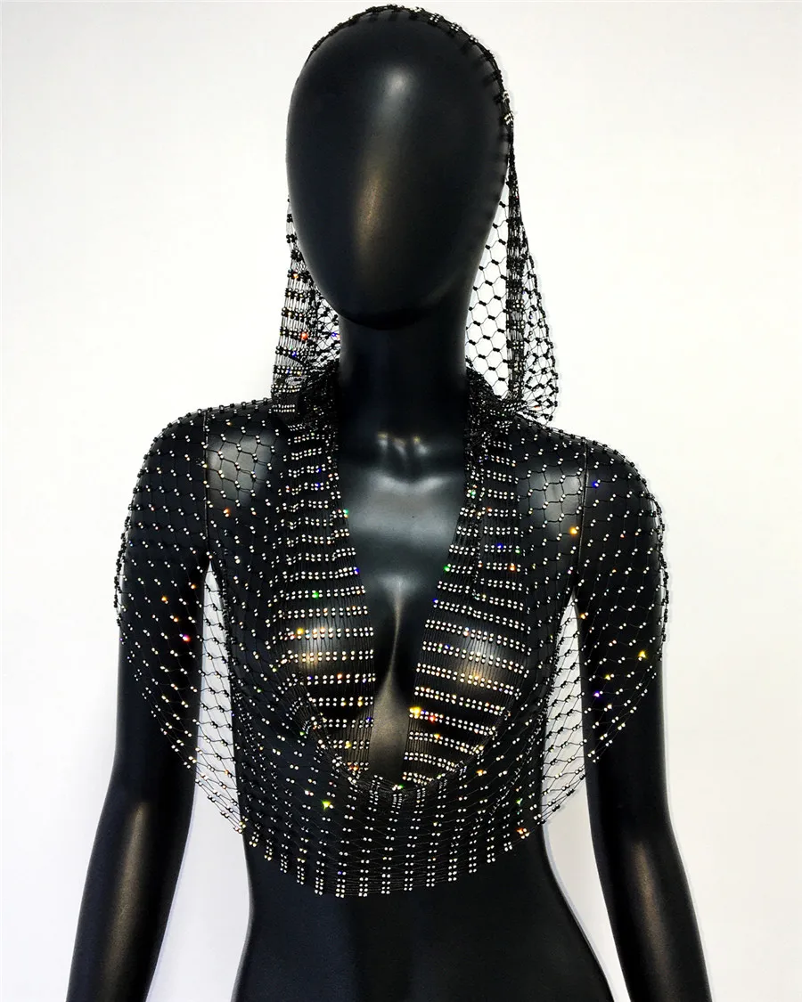 Sexig djup v-hals rygglös kamisole för kvinnor glänsande strass ihålig genomskinlig Fishnet Hooded linne Rave Festival